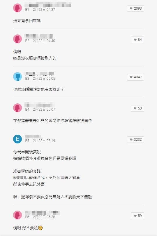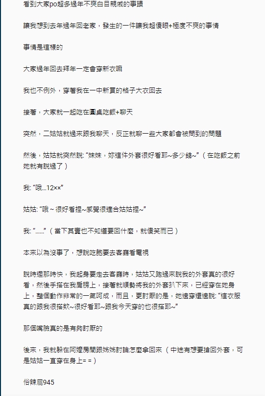 外套,說時遲那時快,二姑下一秒就將手搭在她的肩上,順勢把整件外套從她身上脫了下來,完全沒有經過她同意,等她回過神時,二姑早已經將外套穿在自己的身上了,「整個動作非常的一氣呵成」,過程中二姑還不斷嚷嚷,「這衣服真的跟我很搭欸~很好看耶~跟我今天穿的也很搭耶~」,讓她傻眼不已,直呼「那個嘴臉真的是有夠討厭的!」