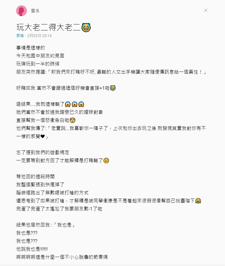 Dcard》上PO文,表示自己當天和國中死黨相約打牌,玩起「大老二」,牌局進行到一半時,一名好友突然提議打賭,表示最輸的人要交出手機讓大家傳訊息給隨機一名異性,而且還要等到對方回了才能解釋打賭一事,後來原PO後來輸了,好友們也沒放過難得的機會,拿起她的手機幫她向暗戀已久的異性告白,「老實說…我喜歡你一陣子了,上次和你出去玩之後 就發現其實我對你有不一樣的感覺」,結果對方遲遲沒有回應,讓她內心無限掙扎,相當緊張,「腦袋裡跑出了無數總被打槍的方式」,甚至負面地自嘲「完蛋了太尷尬了我朋友數要-1了啦」。