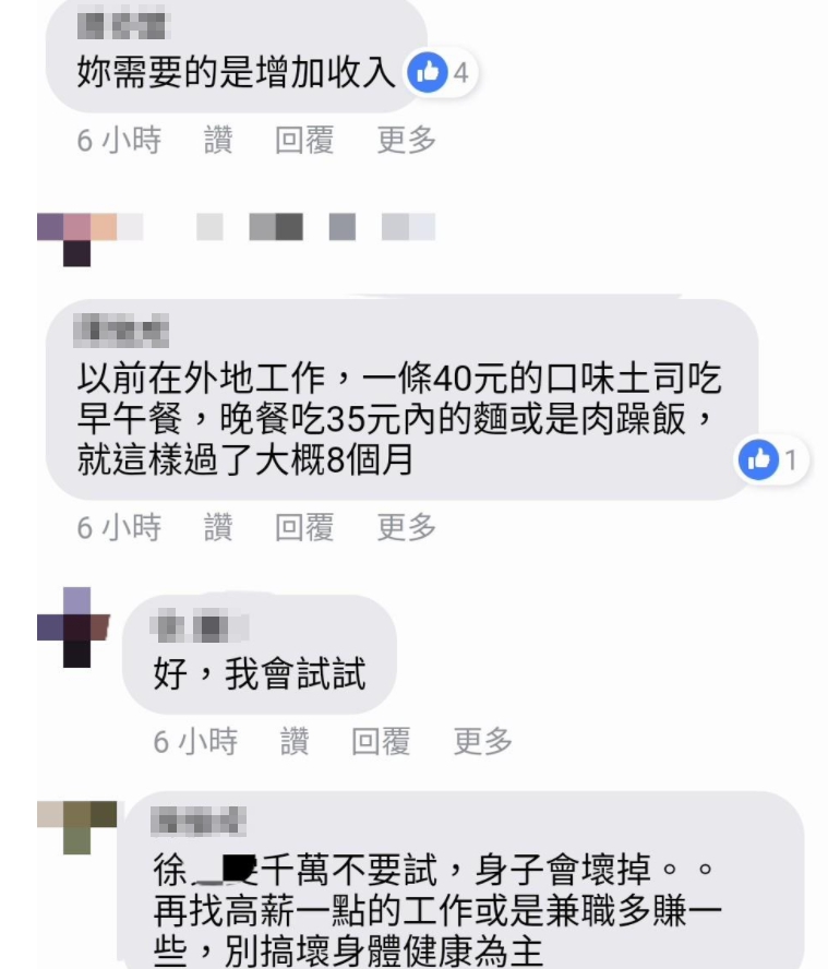 不少網友看了紛紛留言提供方法,「早餐20元的三明治,中午30元的粥,晚餐去買經濟麵條,但吃久了營養不良」、「早午餐一起吃,一餐50元,一個月3000元」、「3餐自己處理的時候,大概一天100吧」,但也有網友建議原PO應該要開源才能治本,「你很省了,建議換薪水高一點的工作」、「你這樣不是辦法,你可以考慮換個工作」、「再找高薪一點的工作或是兼職多賺一點,別搞壞身體健康為主」。