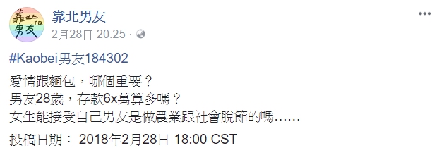 靠北男友」PO文表示,自己的男友28歲,目前有60幾萬的存款,詢問網友這樣的存款是否算多?接著又問,女生能夠接受自己的男友是做與社會脫節的農業工作嗎?由於內心隱隱覺得這樣的生活沒保障,她不禁說出自己內心的掙扎,希望網友提供建議,究竟「愛情跟麵包,哪個重要?」