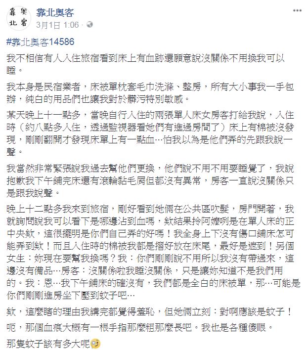 一名民宿業者在臉書《靠北奧客》發文表示,日前有2位自行入住的女房客在晚上11點多打電話給她,向他表示她們發現床單上有一點血,因為入住時床上放著棉被,所以當時沒有發現,原PO聽到之後非常緊張,擔心客人會不高興,所以趕緊表示要過去幫忙更換。