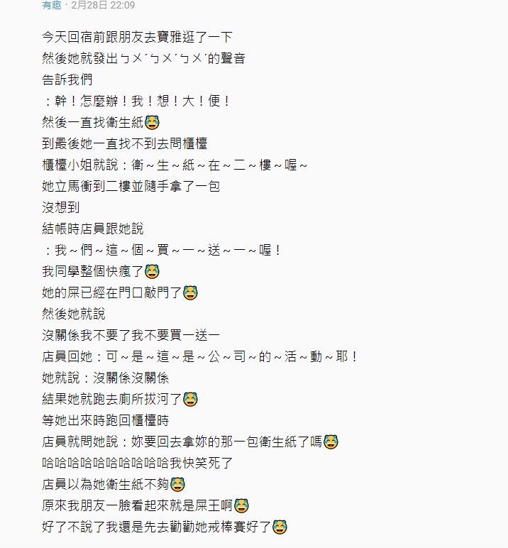日前一名女網友在《Dcard》上PO文,表示自己和好友去逛小型量販店時,先是發出「噗噗噗」的屁聲,接著告訴大家她想上大號,於是大家趕緊到櫃檯詢問