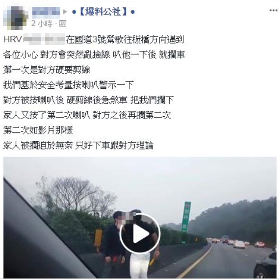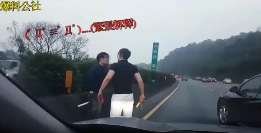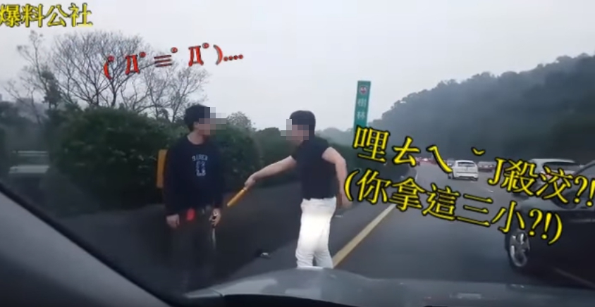 《爆料公社》PO出這段行車紀錄器影片,表示國道3號鶯歌往板橋方向,遇到一台突然亂撿線的黑色小轎車,基於行車安全,便按了一聲喇叭示警,沒想到對方卻2度急煞車將他攔下,隨後一名男子拿著球棒下車,走到駕駛座旁要理論,車主迫於無奈,只好也拿著黃色的防身器具下車。