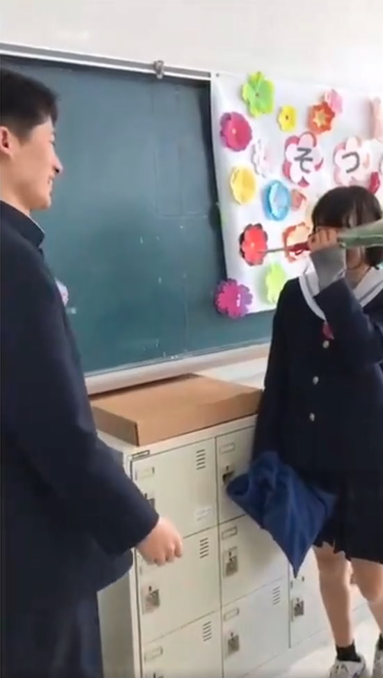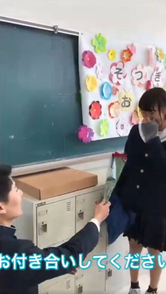 男女雙方就讀佐屋高校,女學生在「@ koteru 27」推特貼出當時的影片。只見男學生從走廊走到女學生的教室,見到對方後,立刻拿出一朵玫瑰花,「儘管我們分開過一次,但請再給我一次機會,跟我交往吧」,並當膝下跪,讓其他女學生害羞尖叫。