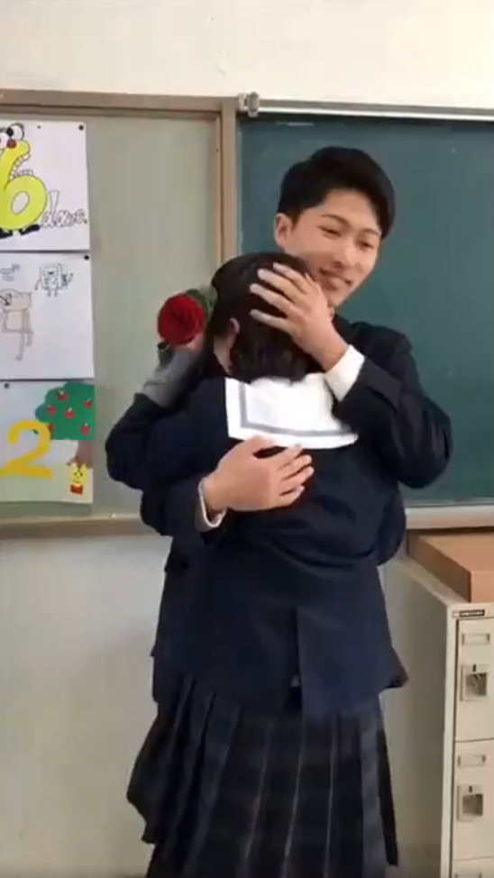 女學生一開始很害羞,聽到男學生的告別,不知該如何是好,但見到前任下跪獻花,她收下花點點頭說好,又掀起教室內一波高潮。女學生被其他人推向男學生,她當場被緊緊抱在懷中、摸頭,喜極而泣。