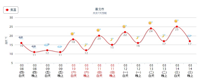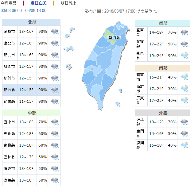 氣象局表示,明天(8日)由於鋒面通過,降雨範圍擴大,除北部及東半部地區有短暫雨外,中南部地區也有局部短暫雨,並有局部較大雨勢發生的機率;鋒面通過緊接著是強烈大陸冷氣團南下,各地氣溫又明顯下降,屬於濕冷型的天氣。周五至下周日(9日至11日)清晨在強烈大陸冷氣團及輻射冷卻影響下,中部以北及東北部低溫約至9到11度,沿海空曠地區下探8度;降雨方面,周五將會是個由濕轉乾的過程,各地降雨逐漸減少;下周日(11日)白天起強烈大陸冷氣團減弱,氣溫逐漸回升,周六(10日)及下周日各地大多為多雲到晴的天氣,僅東部及東南部地區有零星短暫雨。氣象局還表示,本周受到冷空氣南下影響,有再度回到冬天的感覺,提醒大家多加注意。