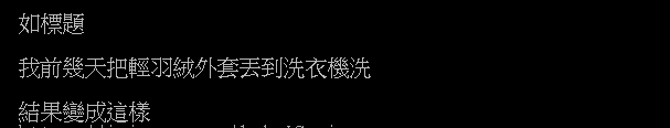 網友在「PTT」上PO出一張照片並表示,將輕羽絨外套丟到洗衣機洗,拿出來以後,整件竟整個面目全非,從照片中可看出,除了原先的膨度都像洩了皮球一樣縮水外,整件還乾癟得掛在窗邊都可透光,還能清楚看到綠色衣架放在衣服內的痕跡,即使乾掉後已經膨回來一些,但還是讓她嚇傻,忍不住急問「請問各位大大這樣還有救嗎?感謝大家!」