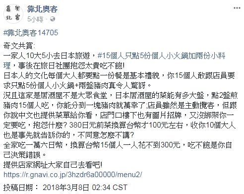 台灣一家大小15人至日本旅遊,在店員招攬之下,到東京新宿一間居酒屋用餐,但因為不餓只點了5份餐,事後卻在旅日社團發文抱怨,價錢貴又吃不飽。一名網友截圖發至「靠北奧客」,直說根本是奇文共賞,自己決策錯誤還要怪店家,要求大家來評理。