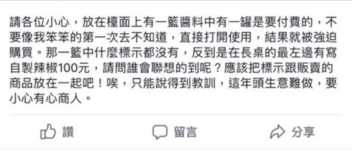從圖中可以看到,這名顧客在評價中「提醒」網友們要小心,「不要像我笨笨的第一次去不知道,直接打開使用,結果被強迫購買」。他意有所指地說,檯面上有一籃醬料是要付費的,但卻沒有任何明確標示,只有長桌最左邊有寫著「自製辣椒100元」,「這年頭生意難做,要小心有心商人」。
