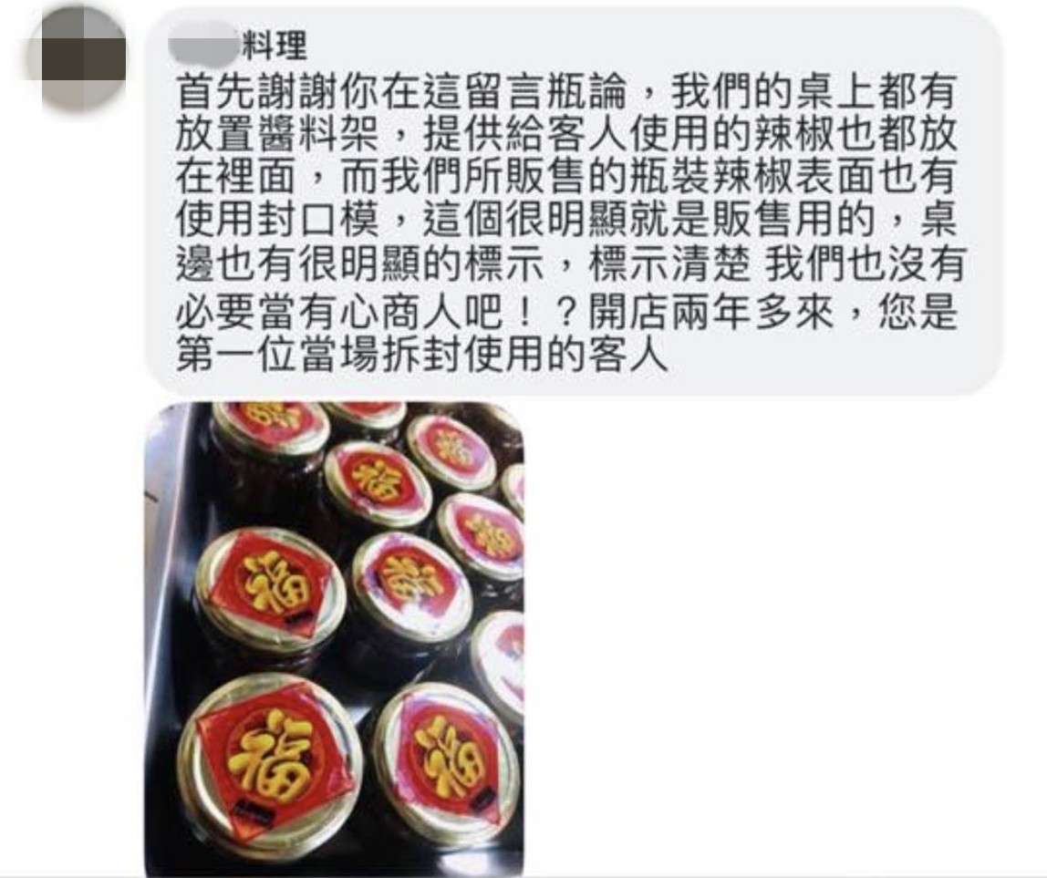 店家看到後,立刻PO出瓶裝辣椒籃子的照片,表示桌上有放置醬料架及提供給客人的辣椒,而且販售用的瓶裝辣椒不僅有封口膜,桌邊也有清楚標示,「很明顯就是販售用」,沒有要當「有心商人」,更何況開店至今2年多,「您是第一位當場拆封使用的客人」。
