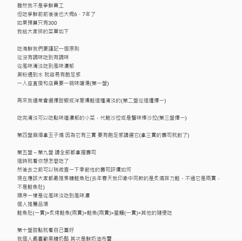 接著,網友切入正題,表示第二盤得從「甜蝦或洋蔥燻鮭」這兩道清淡的下手,吃完了之後才是換「代鮑沙拉或是蟹味棒沙拉」等口味濃郁的小菜,而第四盤他強調一定要拿一盤就有3貫的「玉子燒」,才會有飽足感,接著第五到第九盤則拿「握壽司」,並可依自己喜好隨意挑選或事先查詢季節性的壽司評價,他也推薦個人品項供其他網友參考「鮭魚肚(一貫)>炙烤鮭魚(兩貫)>鮭魚(兩貫)>星鰻(一貫)=其他的隨便吃」,而最後的第十盤則選擇自己喜愛的甜點。