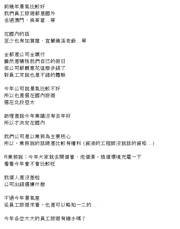 「業務說:今年大家就去開個會、泡個湯,換個環境充電一下,看看今年會不會比較旺」,他感嘆公司是以業務為主要核心,自己只是資歷淺的工程師沒有說話資格,雖然仔細想想,「公司出錢還嫌什麼」,但還是無奈的說「今年景氣差,從員工旅遊來看,也是可以略知一二的」。