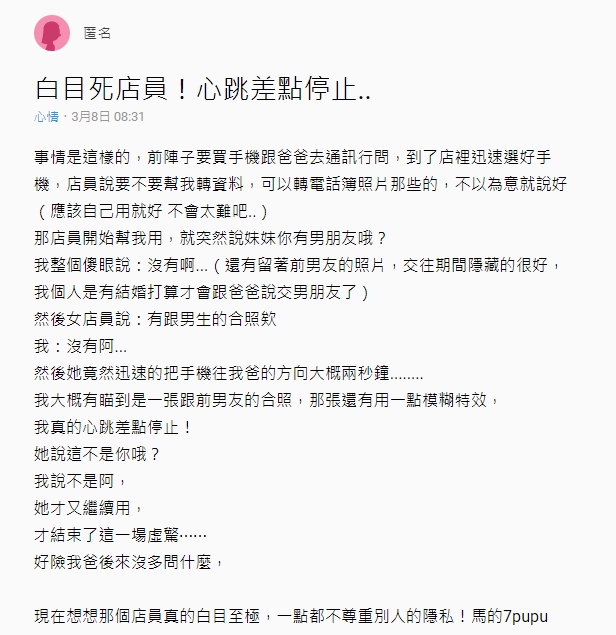 原PO急忙否認「沒有啊」,不料店員不死心,繼續追問「有跟男生的合照欸」,接著就自作主張,用迅雷不及掩耳的速度,把原PO存在舊手機和前男友的合照轉給爸爸看,「我真的心跳差點停止!」,展示完照片,店員又繼續笑問「這不是妳哦?」,原PO再次堅定否認,店員才繼續低頭處理手機,「好險我爸後來沒多問什麼,現在想想那個店員真的白目至極,一點都不尊重別人的隱私!」
