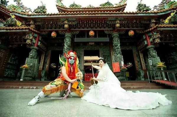打破以往婚紗照浪漫、溫柔的感覺,臉書社團「爆廢公社」裡的一名網友,和大家分享他的超特別婚紗照,有別於大家常常看見的婚紗禮服和一成不變的背景,這名網友和他的老婆選擇把廟當作背景,新郎畫上臉譜、穿著八家將的服裝,新娘則手拿
