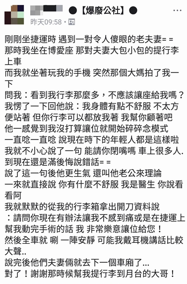 原PO覺得相當委屈,只好默默從行李箱拿出開刀資料,並理性地說「請問你現在有辦法讓我不感到痛或是在捷運上幫我動完手術的話,我非常樂意讓位給您!」由於原PO戴耳機的關係,可能說話音量大了一點,車上頓時鴉雀無聲,而這對夫妻最後惱羞成怒地到下一個車廂去了,令原PO覺得好氣又好笑。