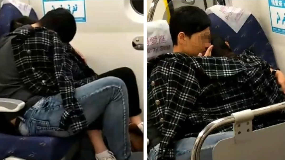 影片中清楚可見女生嬌羞地把頭埋進外套裡,但隱約可看見男方手在裡面蠕動,眼神迷離的望著前方,兩人沉浸在小世界中,完全沒發現已被錄下,接下來男子的舉動簡直嚇壞眾人,他突然抽出手,迅速放到鼻前聞一聞,讓女友害羞地趕快將臉摀住。