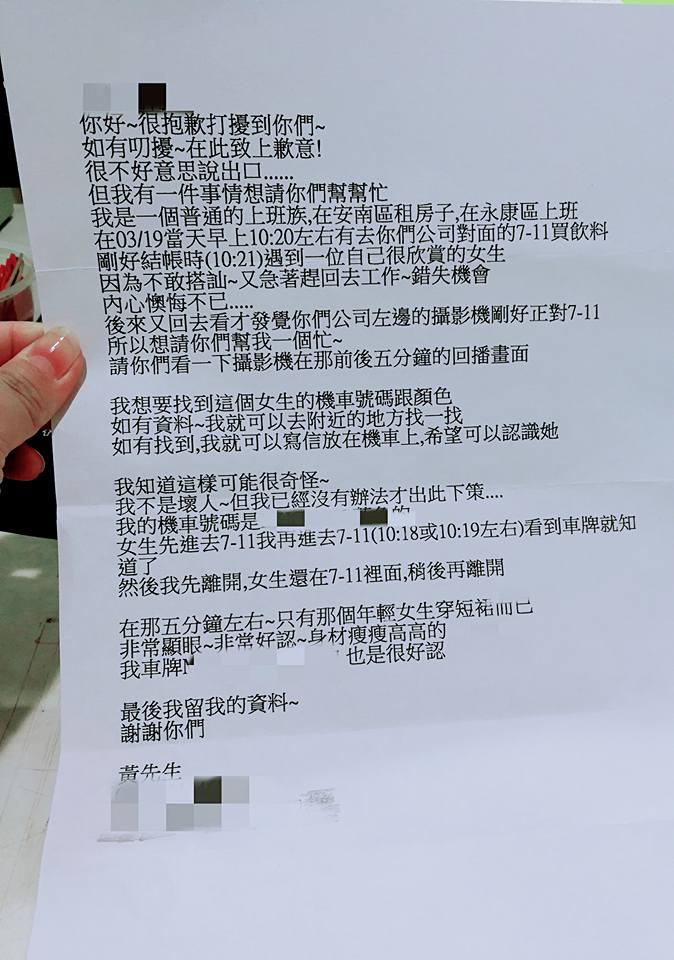 一名女網友在臉書社團《爆廢公社》發文,表示日前公司收到一封信件,內容指出自己是一個住在安南區的普通上班族,表示19日當天到原PO公司對面的便利商店買飲料,就在結帳時,突然遇見讓自己怦然心動的對象,只是當下因為趕時間,就只能這樣錯過了,事後「內心懊悔不已」。