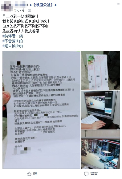 而該上班族回去後,發現原來原PO公司的監視器就對著便利商店的門口,因此突發奇想,附上當日時間,希望原PO公司能利用監視器畫面幫他找到心儀對象的機車「號碼和顏色」,好讓他能有機會將「情書」放置在她機車上,並認識對方。