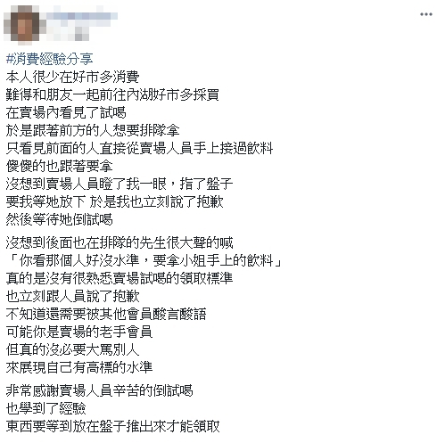 當時後方排隊的先生全程目睹,竟當眾大喊「你看那個人好沒水準,要拿小姐手上的飲料。」令原PO當場尷尬又生氣,認為自己沒有很熟悉賣場的試喝領取標準,也有立刻表示抱歉,其他人沒必要酸言酸語,即便是賣場的老手會員,「但真的沒必要大罵別人,來展現自己有高標的水準!」