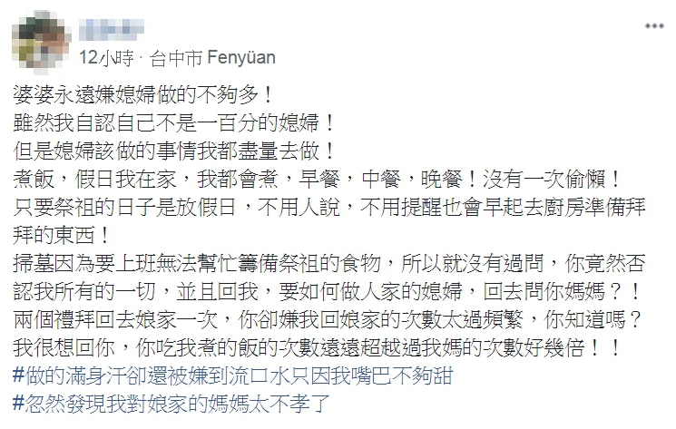 《爆怨公社》發文表示,雖然自己不是一百分的媳婦,不過該做的事情都盡量去做,「