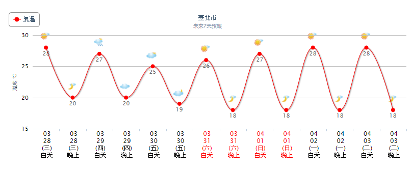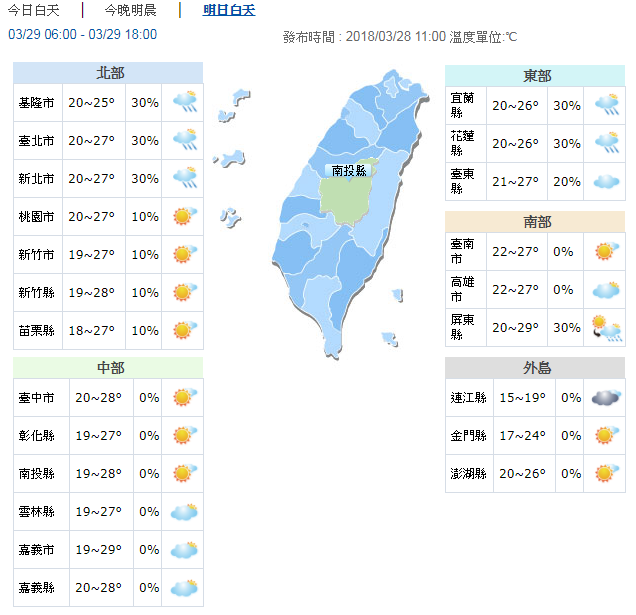氣象局表示,今天(28日)各地天氣大致為多雲到晴,僅東半部及北部山區有局部短暫雨,午後中南部山區及接近的平地也有對流發展的機率,降雨機率稍增;溫度部分,與26日相當類似,清晨各地低溫仍低於20度,西半部高溫來到28、29度,東半部也有26、27度,西半部日夜溫差大,請適時調整衣物的穿著。氣象局並指出,周四至下周二(29日至4月3日)各地天氣大多為多雲到晴,東半部地區及北部山區有局部短暫雨外,午後中南部山區也有零星雨;氣溫部分,除了周四、周五北部因東北風稍增強,高溫略降外,整體變化不大,各地白天大致舒適溫暖,各地高溫約25至29度;不過,早晚仍有涼意,低溫約16到19度。
