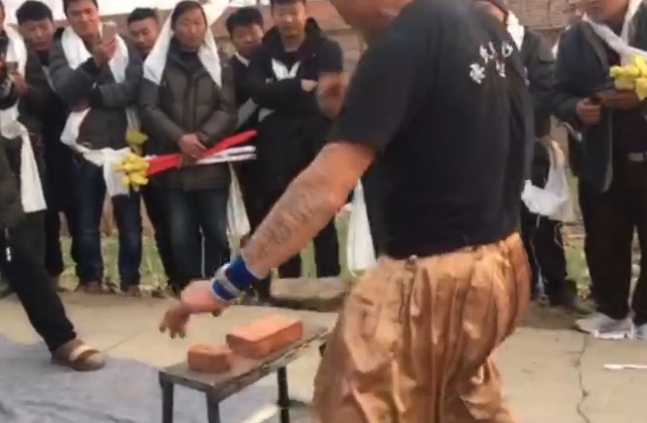 ▼ 手劈磚頭也是表演橋段之一。(圖/翻攝自《梨視頻》)