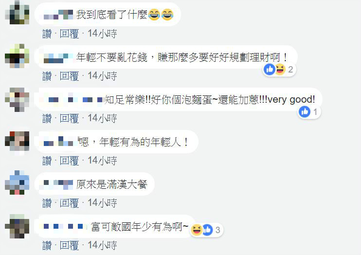 23k就這麼滿足,我們連泡麵都吃不起啊」、「有錢就是任性」、「好羨慕在網咖還能吃泡麵喝飲料的人喔」、「我到底看了什麼」、「知足常樂!好你個泡麵蛋~還能加蔥」、「新鮮人的起薪告白」、「怎麼看完有點想哭」、「下次記得加貢丸,彰顯你的地位」,有人還貼心提醒要他好好存錢做規劃,不過也有網友認為原PO是在反諷薪資太低。