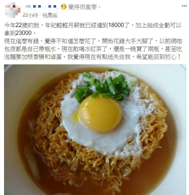 網友在臉書社團「爆廢公社」發文,他提到自己今年22歲,每個月薪水為1萬8000元,加上抽成全勤可以拿到2萬3000元,不過卻有個煩惱,「現在這麼有錢,都不知道怎麼花了」,原來他認為自己開始花錢大手大腳了,他舉例自己以前網咖包夜都是自己帶水,但現在敢點冰紅茶喝了,還一晚買兩瓶;甚至連吃泡麵都要加根香腸和滷蛋,他擔憂的說:「我覺得現在有點迷失自我,希望能回到初心!」