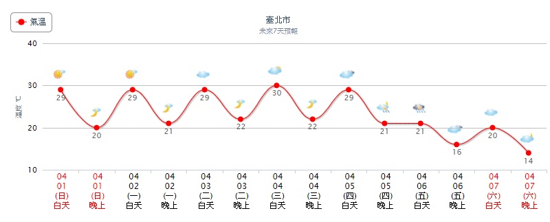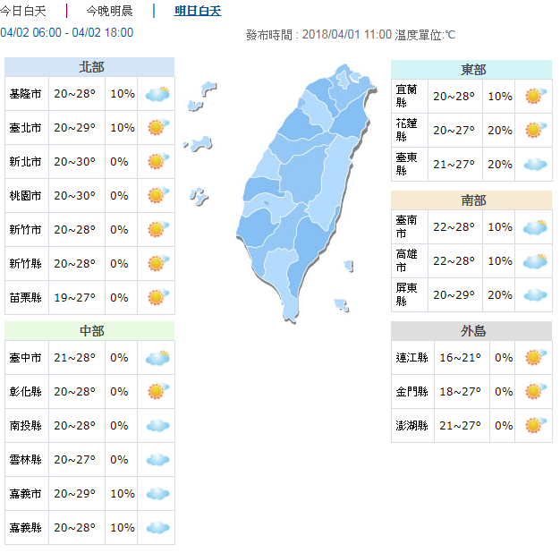 中央氣象局表示,今天(1日)各地大多陽光露臉,東半部地區、北部山區有零星降雨,南部地區清晨間因為風向輻合關係,有機會出現小範圍降雨,要注意的是午後在各地山區仍會有局部熱對流發展;氣溫部分,晨間略涼,各地低溫約18至22度,白天溫暖,高溫預計都在26度以上,西半部更可以來到29、30度。氣象局也預測,明天到,周一至周四(2日至5日)清明節當天,天氣狀況和今天差不多,各地大多為多雲到晴的天氣,僅東半部地區偶有零星雨,各地山區在中午過後易有局部熱對流發展,並可能往附近區域擴展,提醒午後在山區及近山區活動留意天氣變化;氣溫部分,晨間舒適,白天溫暖,紫外線指數偏高,外出活動請注意防曬並多補充水分。