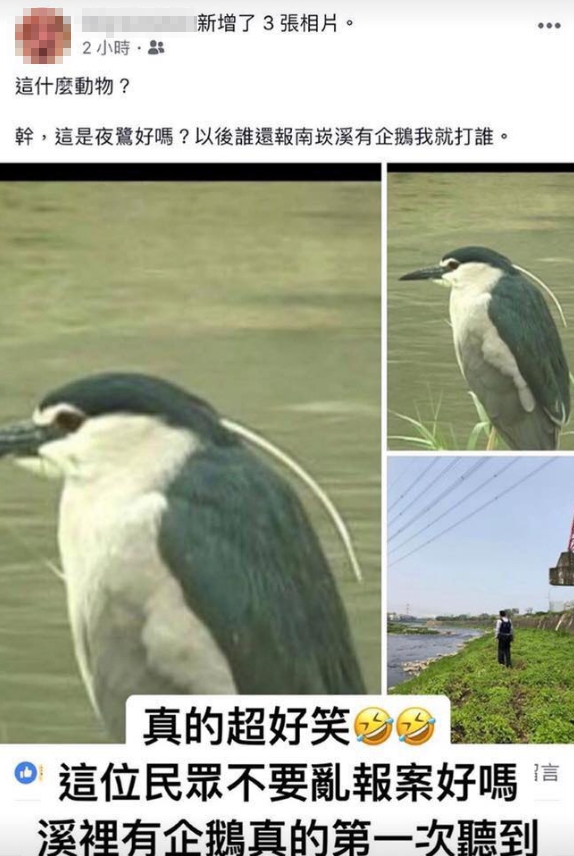 夜鷺好嗎?」,接著開玩笑表示,「以後誰還報南崁溪有企鵝,我就打誰」,而這則趣事也被分享到《TPC台灣鸚鵡聯盟》等臉書社團,引發不少網友大笑。