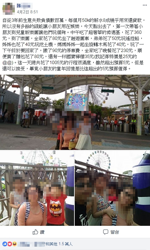 陳爸爸算一算,這一天他總共花了1005元,雖然超出預算5元,但對於一整天的玩樂行程感到很滿意,因為如果用這一點點超支的預算,換取孩子快樂的回憶,他感到很值得。而且從他貼出照片可以看到孩子們無憂的樣子,「樸實的幸福」大概就是這個樣子。