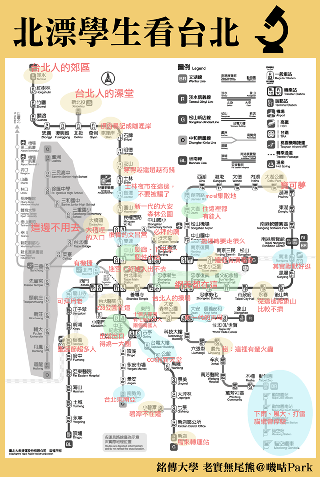 一名來自台中的大學生,住在台北三年了,最近因為朋友說放假要到台北找他玩,因此他花了時間按照捷運路線,整理了一份「台北觀察