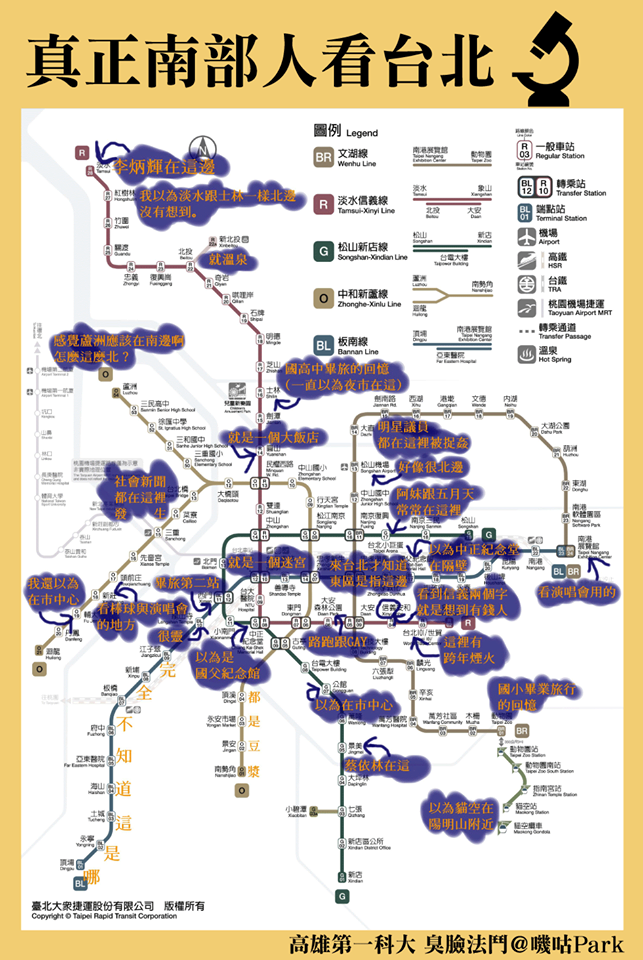 另外,有正港南部人看了「北漂學生」的註解後,忍不住吐槽「看了這個圖覺得這個中部人,真的是在台北待太久了,都忘記自己的根不是在台北了」,緊接著他也花了一點時間,整理出只有畢業旅行才會去台北的南部人想法,像是「社會新聞都在橘線發生」、「台北車站宛如迷宮」、「明星議員都在大直被抓姦」、「圓山只是一個大飯店」、「以為中正紀念堂和國父紀念館在隔壁」、「101有跨年煙火」。