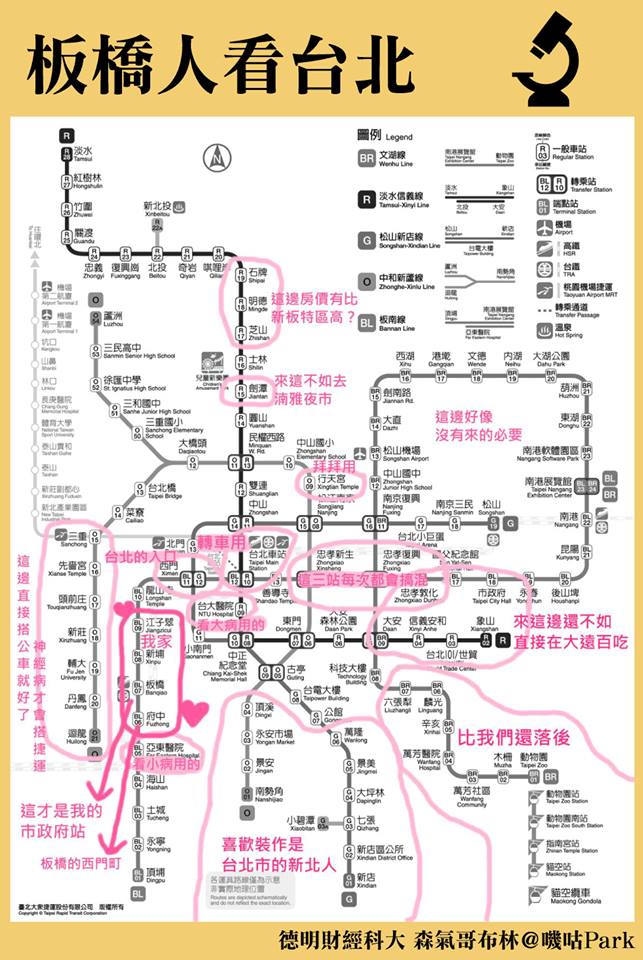 而大家聽到北部,弟一直覺反應都是想到台北市,有住在板橋的新北人不平,「畢竟我們板橋算起來也是新北市的首善之都,常常被人忽略就覺得好難過啊Q」,因此她也做了一張自己演中的台北,好比說「台北車站只是轉車用」、「內湖地區沒有去的必要」、「六張犁到動物園那段很落後」、「去士林夜市不如去湳雅夜市」、「天母房價有比新板特區高嗎?」
