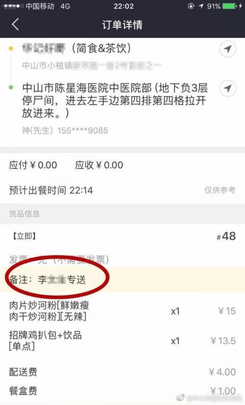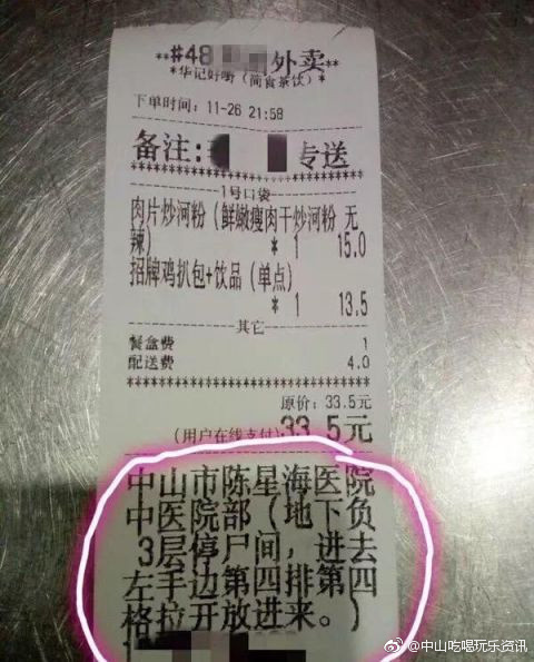 根據《華西都市報》報導,近日廣州中山小欖鎮通訊軟體中流傳一筆外送單,這位客人在晚上9點58分點了肉片炒河粉和招牌雞扒包,共花費33.5人民幣(約152台幣),然而吸睛的是,上面的地址竟寫著「中山市陳星海醫院中醫院部(地下負3層停屍間,進去左手邊第4排第4格拉開放進來)」,位置標示得相當明確,還指定要一名李姓外送員配送。