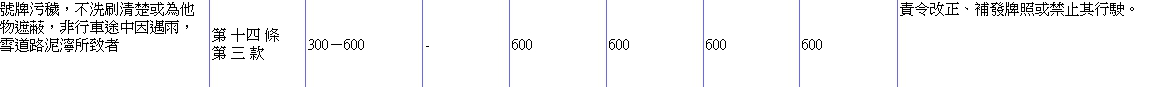 而根據《道路交通管理處罰條例》第十四條第三款「號牌污穢,不洗刷清楚或為他物遮蔽,非行車途中因遇雨,雪道路泥濘所致者」可處300到600元罰鍰,並責令改正、補發牌照或禁止其行。