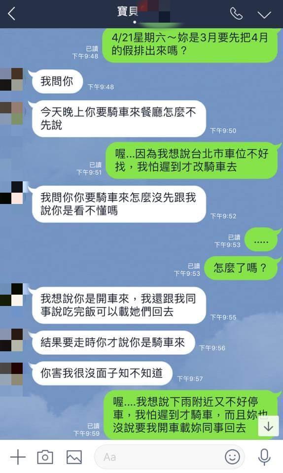 當初分手的導火線,是因為男子顧慮到車位不好找,於是在下雨天騎機車去載女友,想不到對方立刻翻臉,因為她已經答應可以順便載同事回家,狂飆男子害她沒面子,暴怒提出分手。