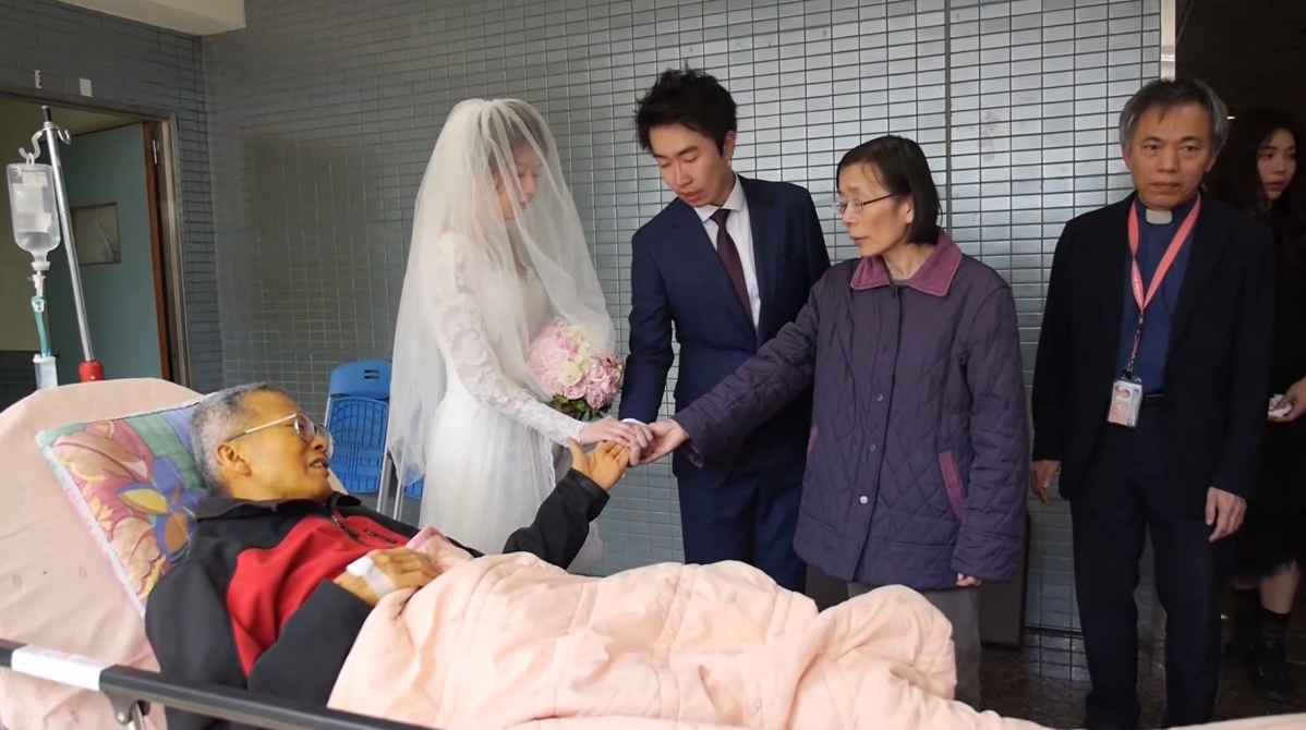 頭紗,接著再趕回去完婚,當躺在病床上的父親輕聲叮嚀「妳一定要幸福」時,在場親友及醫護人員,都忍不住的流下眼淚。