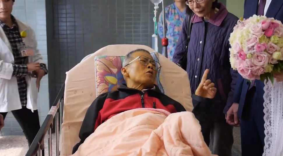 接著在牧師的見證下,帶著周邊的親友和醫護人員的祝福,新娘蓋上了頭紗,這一幕也讓全場紅了眼眶。帶著父母親的祝福,長跑11年的新人北上完婚,也讓父親了結一樁心願。