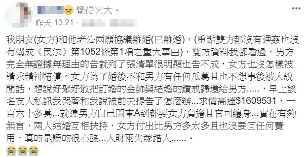 「我說被前夫提告了,怎麼辦…?」,從清單中可以看見,前夫洋洋灑灑列出包括婚禮的各種花費、蜜月旅行和生活開銷、雜支等23項目,外加「精神賠償」共160萬9531元,要求女子必須全額負擔,為了避免落人口舌,女子已將訂婚的金飾與結婚的鑽戒歸還給前夫,期望能好聚好散,沒想到前夫不就此作罷,堅持提告,「就連男方自己開車A到都要女方負擔且官司纏身…實在有夠無言,兩人結婚互相扶持,女方付出比男方多太多且也沒要回任何費用,真的是聽得很心酸…人財兩失嫁錯人。」
