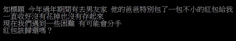 《Boy-Girl》看板發問,表示自己和男友正面臨一些困難,可能會以分手收場,但讓她更苦惱的是,在今年過年她到男友家拜年,當時收下了男友爸爸包了一筆「金額不小」的紅包,但她「一直收好」,強調沒有花掉,也沒有存起來,而隨著2人緣分可能要就此斬斷,紅包的去留也讓她相當煩惱,「該
