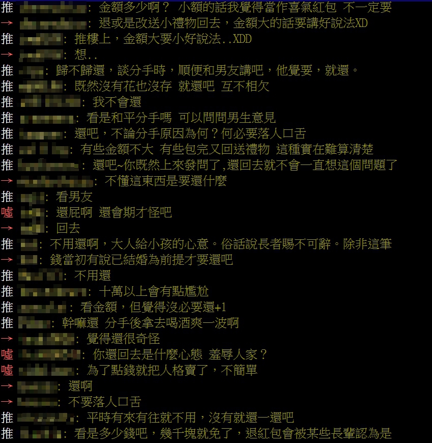 不過有網友認為,可以和男友或是家人討論再做決定,「跟男方講清楚啊…不是每個男方都喜歡送出的東西被還」、「要給就不會要回來,但是分了就不一定,除非男方那裡對錢很敏感」、「談分手時,順便和男友講吧,他覺要,就還」、「看是和平分手嗎?可以問問男生意見」、「有些長輩非常介意被退紅包喔,原po可以問看看其他長輩怎麼退才不會失禮」、「要看他們家人在不在意吧」。