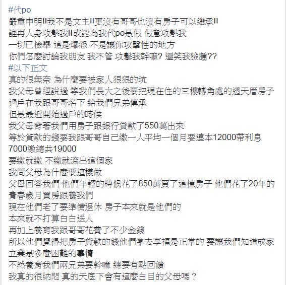 一名網友請朋友在臉書不公開社團「爆怨公社」貼文,抱怨自己「被家人狠狠地坑」了,他說明,父母以前就說好,等他和哥哥長大之後,會將位在轉角的三層樓透天厝過戶給他們,想不到近日開始要過戶了,他竟發現父母用房子向銀行貸款了550萬元,要他和哥哥繳貸款,讓他相當傻眼,仔細算下來,貸款1萬2000元加上7000元利息,一個人一個月就要付1萬9000元。