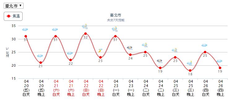 這幾天氣溫逐漸回升,可是接著又要變天了!中央氣象局表示,昨天(19日)東北季風減弱,而今天(20日)持續多雲到晴、穩定的天氣,各地高溫約30至32度,感受稍微悶熱,而且接著下來會越來越熱。不過下周一(23日)又有新一波鋒面靠近,將會使溫度下降,最低溫大約在17到18度左右。