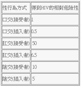 而衛福部疾管署網站顯示,只要性行為的過程中沒有全程使用保險套或選用水性潤滑液(保險套搭配油性潤滑物質使用易變質破損),皆有感染愛滋病毒的風險,若將口交(接受者)感染HIV的相對危險性定義為1,以無套肛交感染愛滋病毒的相對風險最高,不同性行為危險程度如下:
