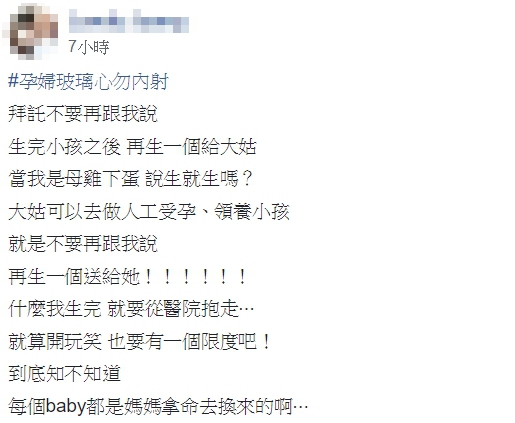 原PO感嘆,大姑如果真的很想要小孩,可以去做人工受孕,或是領養小孩,「就是不要再跟我說,再生一個送給她!!!」婆家甚至還曾說過,等她生完小孩,就要直接將嬰兒從醫院抱走,她越聽越傻眼,痛批「就算開玩笑,也要有一個限度吧!到底知不知道,每個baby都是媽媽拿命去換來的啊…」。