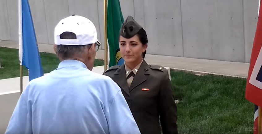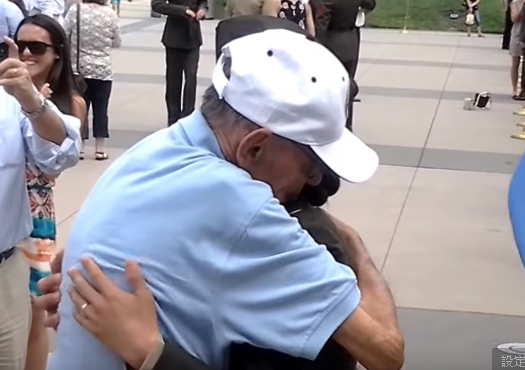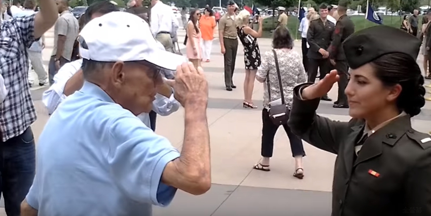 其實這段影片是2013年時上傳的,影片中可見一名上士退役的老爺爺詹姆士向剛掛階的美國海軍陸戰隊女少尉夏綠蒂行禮,並要求她「准許擁抱孫女」,在女少尉答應他的請求後,老爺爺也向前將眼前的女少尉擁入懷中,場面看起來相當溫馨,連一旁的民眾也忍不住拍手叫好。