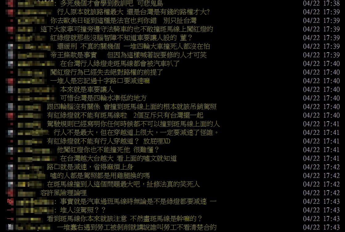 但也有人支持法官判決,「經過斑馬線本來就該注意,就像經過學校大門口就應該放慢」、「在國外遇斑馬線必減速,人行道上有人就會停車確認有沒有要過馬路,在台灣這樣開應該會被後車叭死或超到前面逼你車」、「他闖紅燈你也不能撞死他,很難懂?」、「事實就是汽車過斑馬線時無論是不是綠燈都要減速,一堆人沒駕照?」