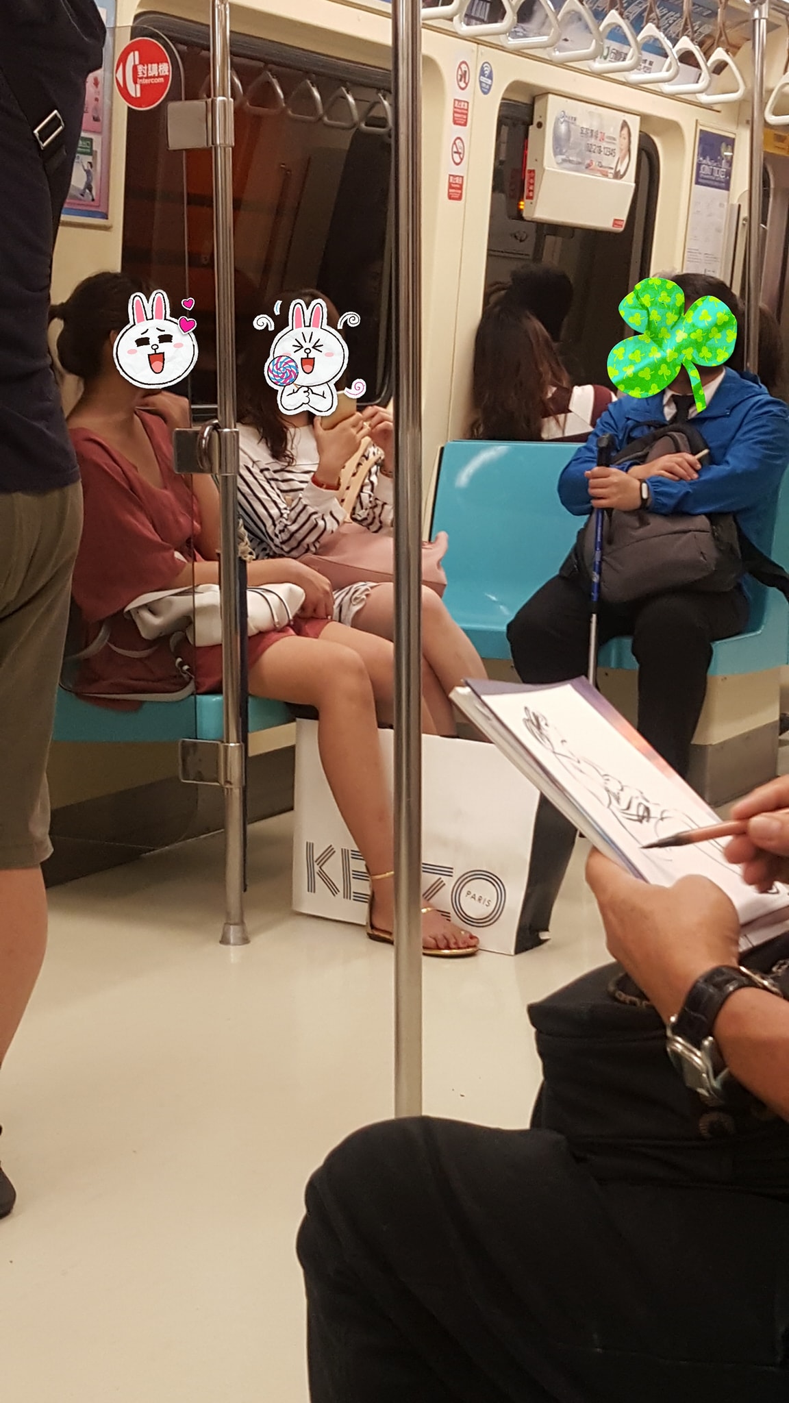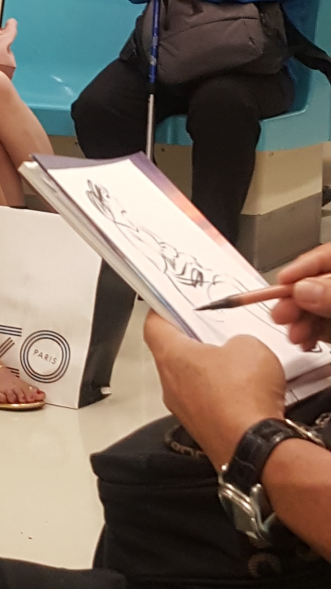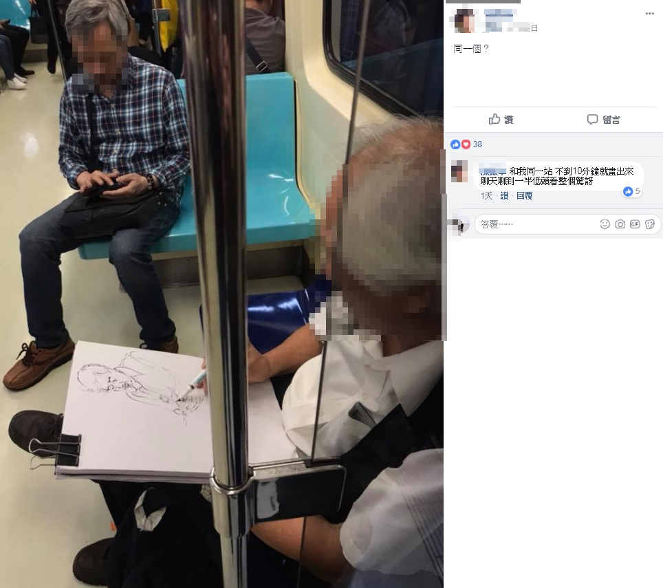 一名女網友24日下午在臉書社團《爆廢公社》中分享照片,原來她在搭乘捷運時,遇到了一明年約65至70歲的阿伯,只見阿伯左手拿紙右手拿筆,看著坐在對面的兩名辣腿正妹,手也跟著游移了起來,沒想到短短不到一分鐘的時間,就在紙上勾勒出女孩的線條,讓女網友看傻了眼,隨即拿手機拍下來和網友分享。