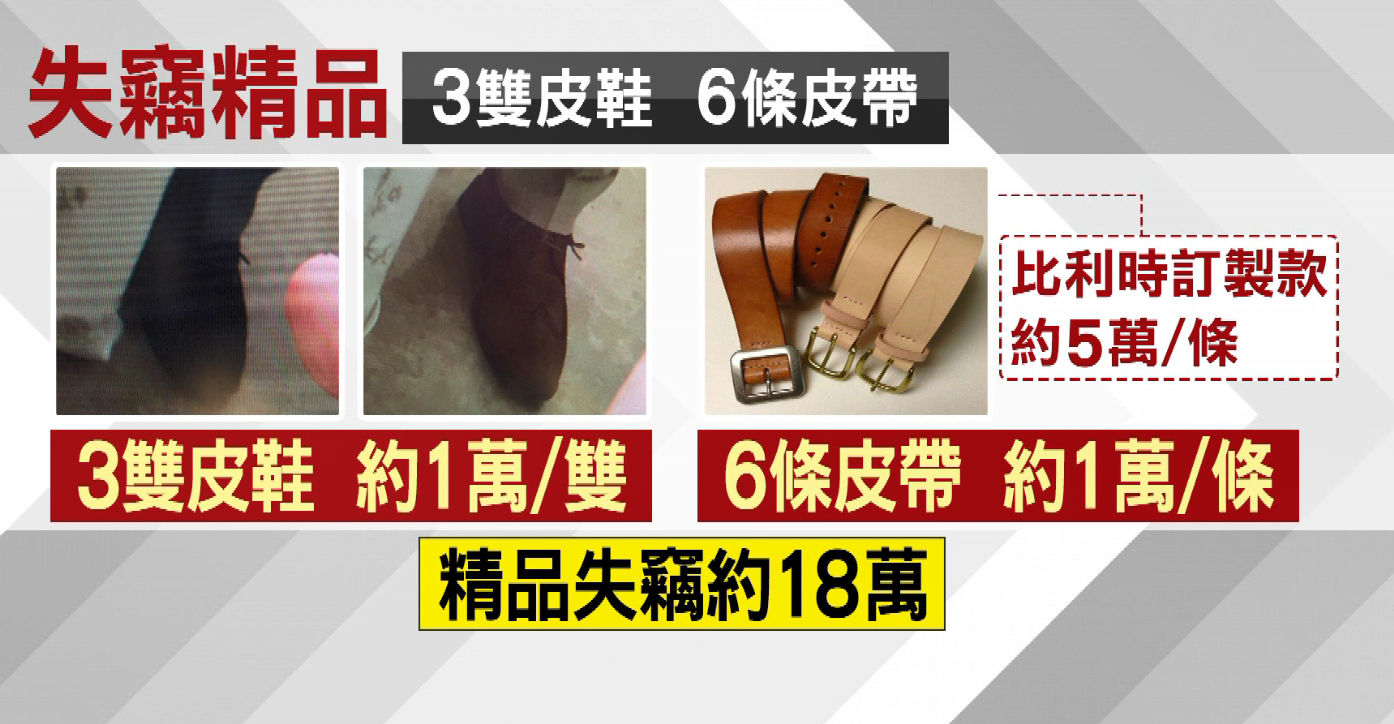這次失竊的3雙鞋子、6條皮帶都是知名精品,3雙鞋子每雙分別要價台幣約一萬多元,皮帶更是特別訂製,其中一條,是歐洲比利時訂製,要價約五萬,總計下來,約18萬元的精品,都被丟掉了。